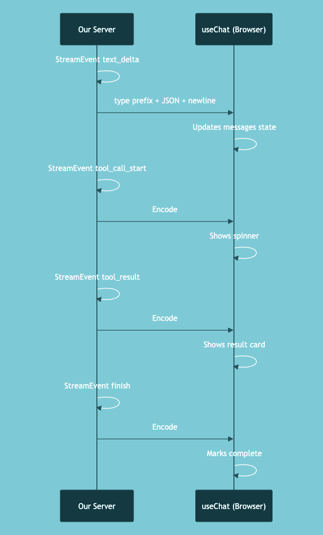 We kept useChat on the frontend, which means our server must emit events in a format the hook understands. The Vercel AI SDK uses a line-based protocol where each event has a type prefix.