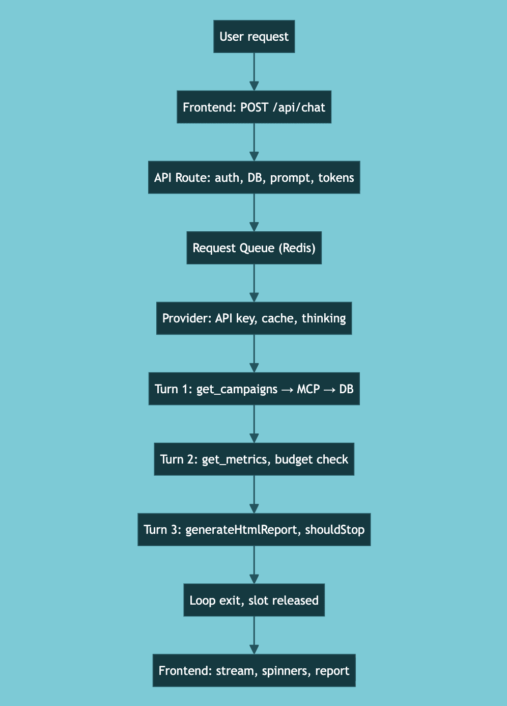 google_ads_get_campaigns, executes via MCP, saves full output to DB, feeds truncated version backAgentic Loop — Turn 2: LLM analyzes data, calls