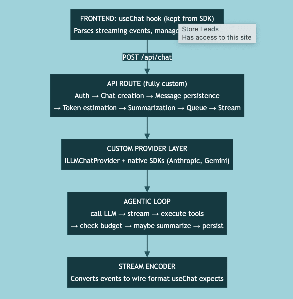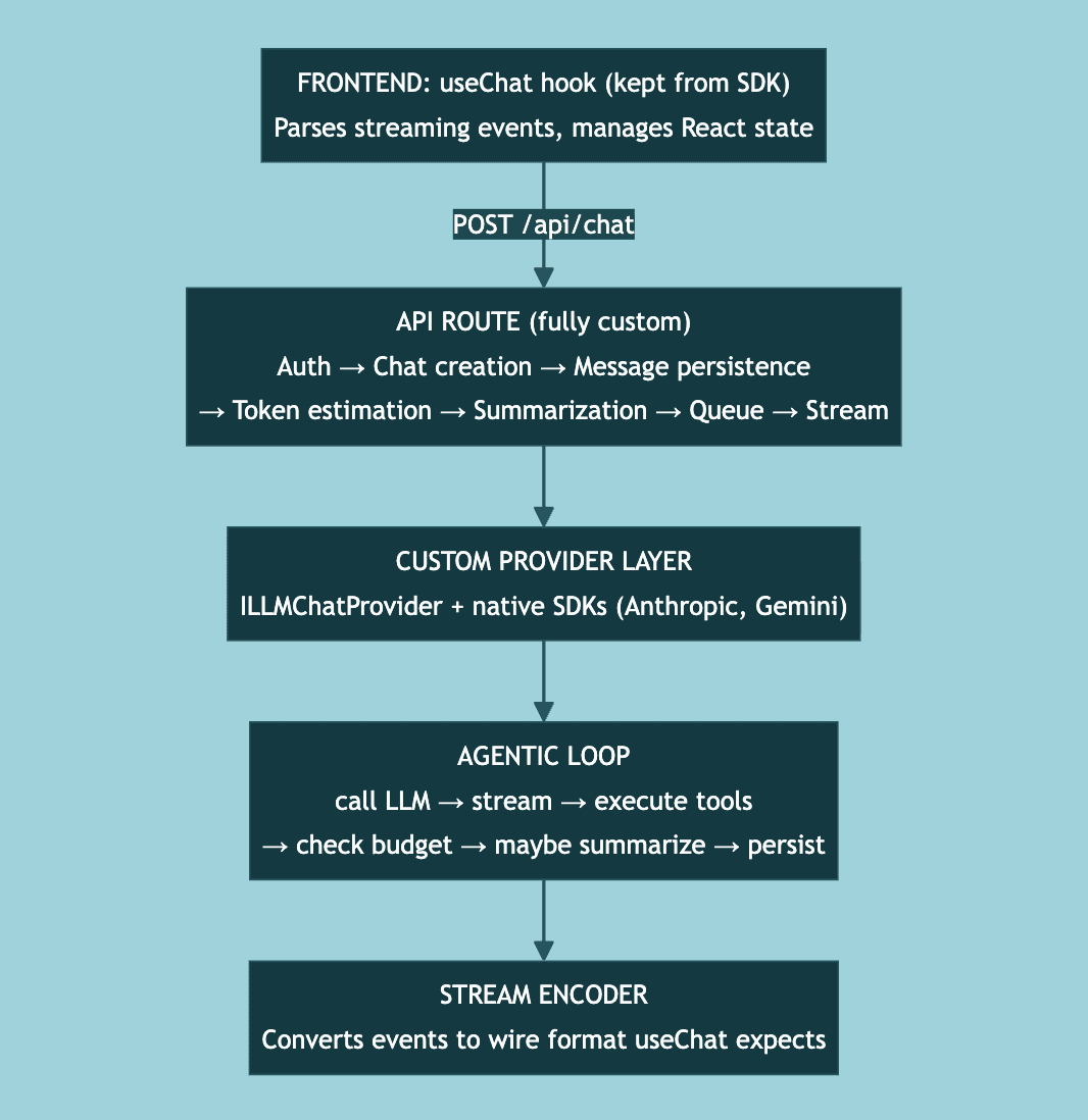The React hook was good. It handled message state, input management, streaming display, loading indicators. Reimplementing all of that would have been wasteful. But we needed full control of what happens between the API route receiving a request and the response streaming back.