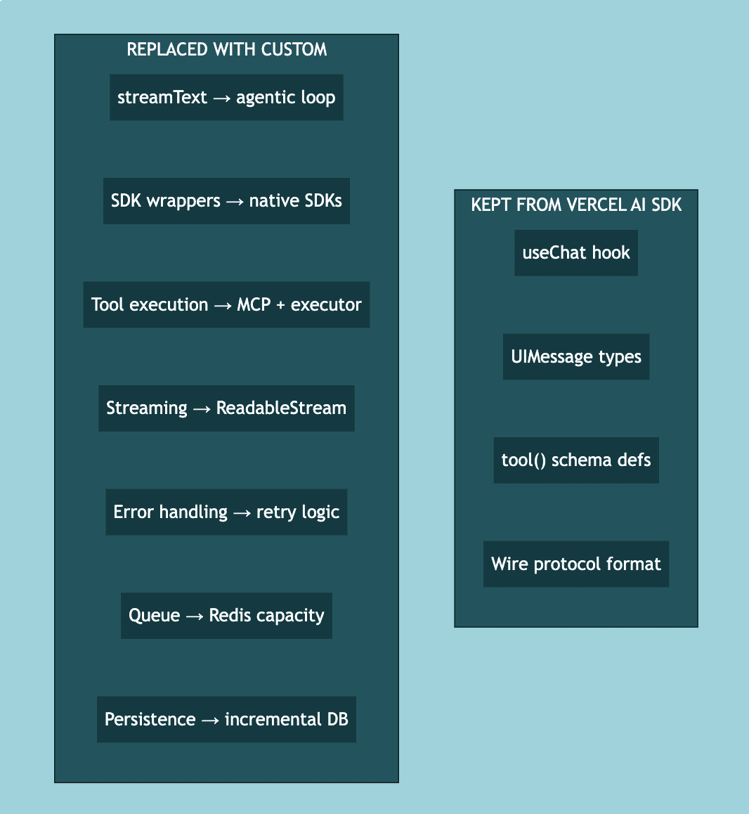 The custom engine is roughly 3,000 lines of code across the provider layer, the agentic loop, the stream encoder, and the queue system. That's code we maintain, test, and debug ourselves.
