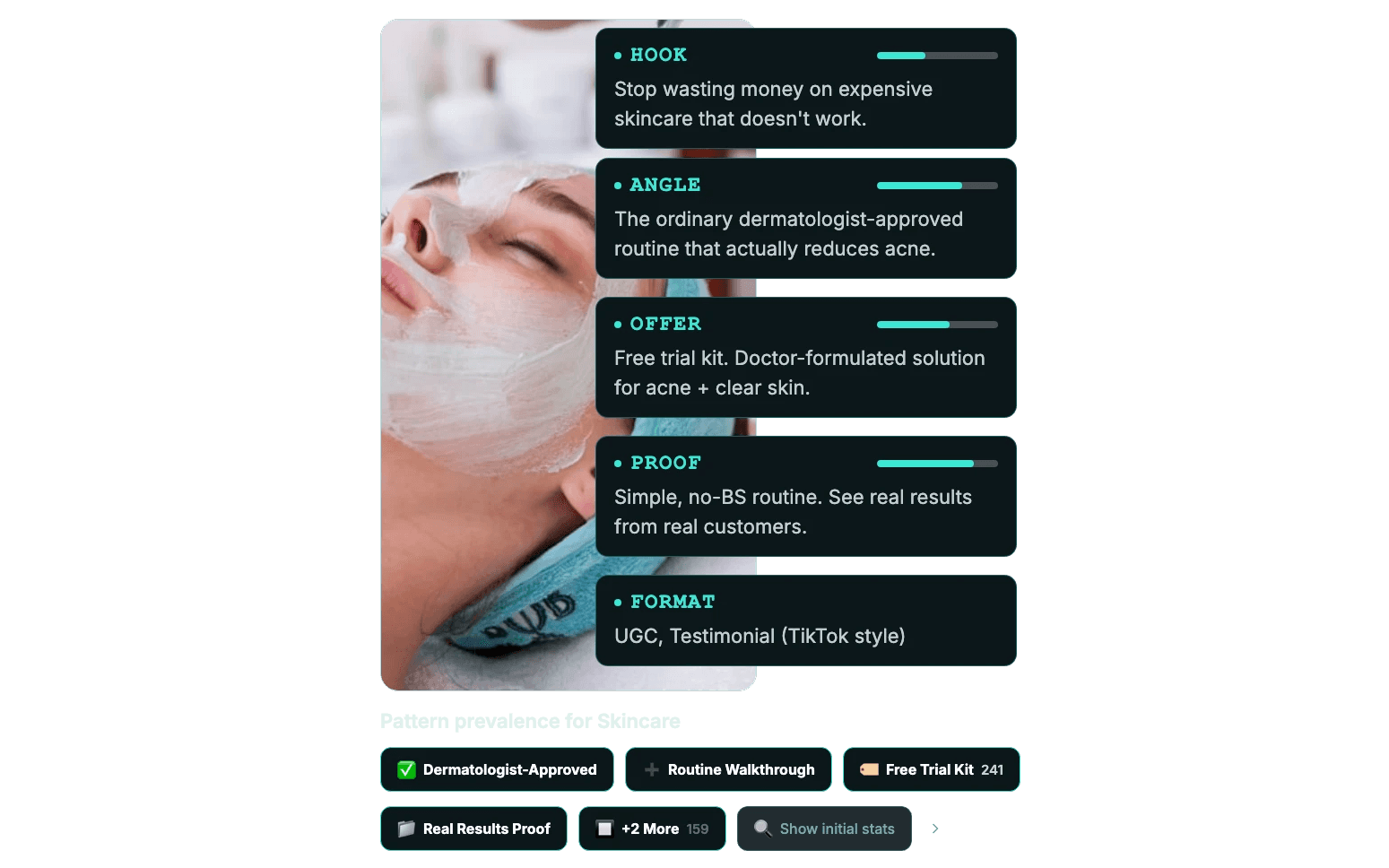 GoMarble breaks down ads into hooks, angles, offers, proof, and formats—and surfaces the winning patterns across your category.