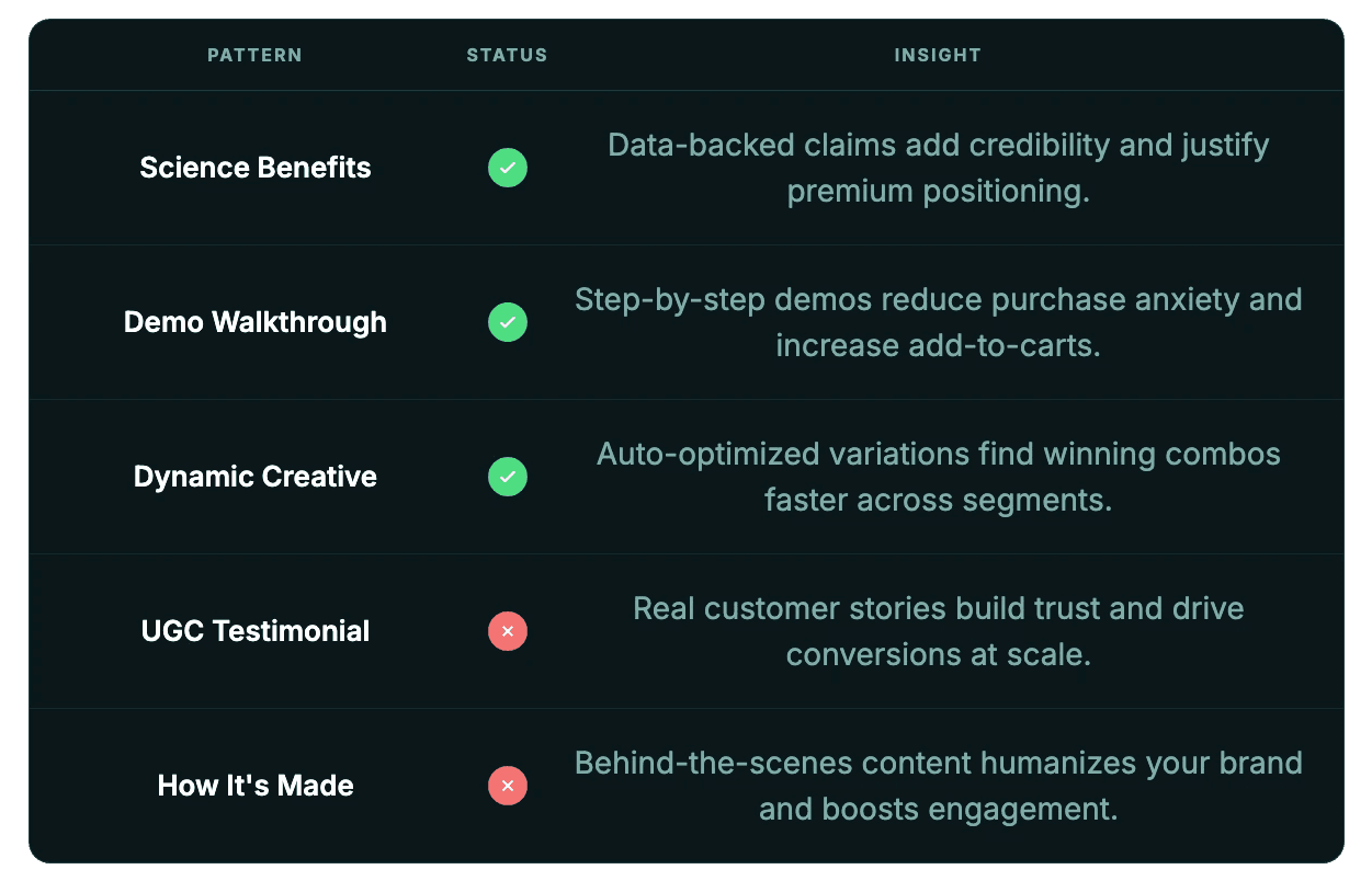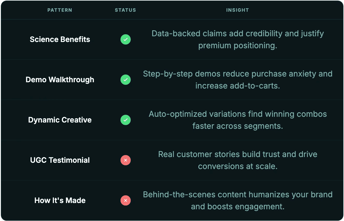 Connect your ad accounts and see which patterns you’re under-using, what’s missing, and where competitors are out-positioning you.