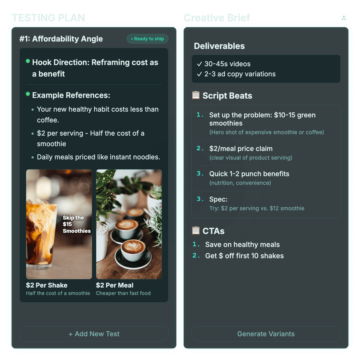 GoMarble turns research into a ready-to-ship testing plan—angles to try, hook directions, example references, and clear creative guidance for your next set of ads